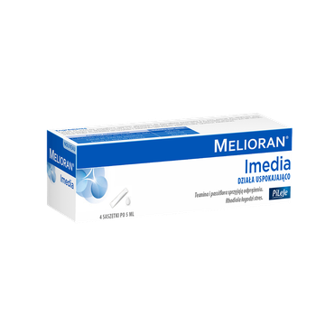 Melioran Imedia na bazie specjalnie wyselekcjonowanych składników: ekstraktów z L-teaniny, passiflory oraz rhodioli przeznaczony jest dla osób potrzebujących odprężenia w sytuacjach okazjonalnego stresu lub oczekiwania. Teanina i passiflora sprzyjają odprężeniu. Rhodiola łagodzi stres. Przeciwwskazania: Niezalecane dla dzieci poniżej 12 roku życia, kobiet w ciąży lub karmiących piersią oraz osób z chorobą afektywną dwubiegunową. W przypadku jednoczesnego stosowania leków psychotropowych skonsultuj się z lekarzem. Zaleca się monitorowanie stanu zdrowia jeśli Melioran przyjmowany jest jednocześnie z lekiem na nadciśnienie tętnicze.